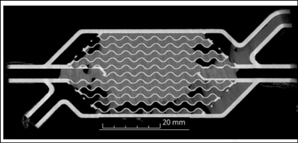 Figure 2: X-ray CT-scan cross-section of the PBF-LB/Al F357 HX showing trapped powder.