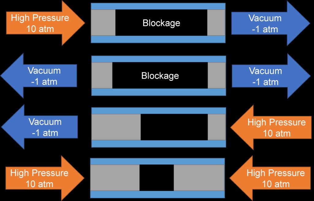 The REM powder declogging system is designed to effectively deliver the selective chemical formulations deep into the internal cavities of additively manufactured components. The system operates by pressurizing the chemistry into the part’s internal network while simultaneously applying a vacuum at the opposing end, establishing a dynamic flow path that drives the solution through otherwise stagnant or occluded regions. This process employs a controlled sequence of alternating pressure and vacuum cycles, which enhances fluid penetration and promotes the gradual dissolution and removal of trapped powder (Figure 3). Beyond the mechanical forcing of the liquid, capillary action plays a crucial complementary role, once the chemical solution makes contact with the powder agglomerates or caked regions, capillary forces rapidly draw the fluid into the fine interstitial spaces of the powder cake. This accelerated wetting mechanism enables the reactive chemistry to efficiently engage with the powder surface, facilitating uniform dissolution throughout complex, tortuous passages. The combination of chemical selectivity, controlled fluid dynamics and capillary-driven transport enables REM’s process to achieve thorough powder clearance in geometries otherwise inaccessible by traditional cleaning or mechanical removal techniques.