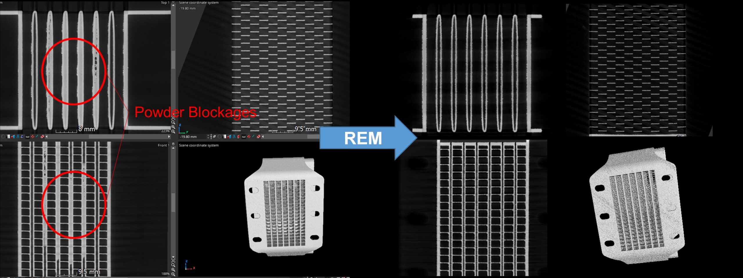 A second case study was conducted on a PBF-LB/AlSi10Mg heat exchanger featuring a more traditional, multi-channel core architecture with a higher channel density and reduced individual passage diameters compared to the TPMS design (Figure 5). This configuration presented a more severe powder removal challenge, with substantial clogging observed in the central regions of the core where access by conventional cleaning methods was highly restricted. Prior attempts using mechanical vibration, ultrasonic agitation, and fluid flushing techniques proved ineffective at clearing the trapped powder, featuring the limitations of standard post-processing methods for dense, internally complex AM parts. The component was subsequently treated using REM’s declogging system for approximately 30 minutes, employing alternating cycles of pressurization and vacuum to drive the selective chemical solution throughout the internal passages. Post-processing X-ray CT scans confirmed the complete removal of powder, even in the most confined regions, with no evidence of wall breach or structural compromise. Moreover, dimensional verification demonstrated excellent geometric fidelity, reaffirming that the selective chemical dissolution approach achieves thorough internal cleaning while fully preserving the part’s design intent and mechanical integrity.